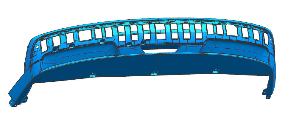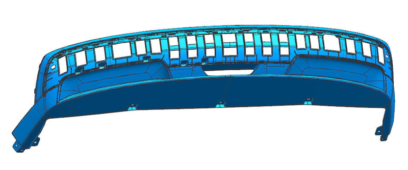 This rear bumper lower guard is a long, thin-wall exterior component with repetitive openings and non-uniform geometry.